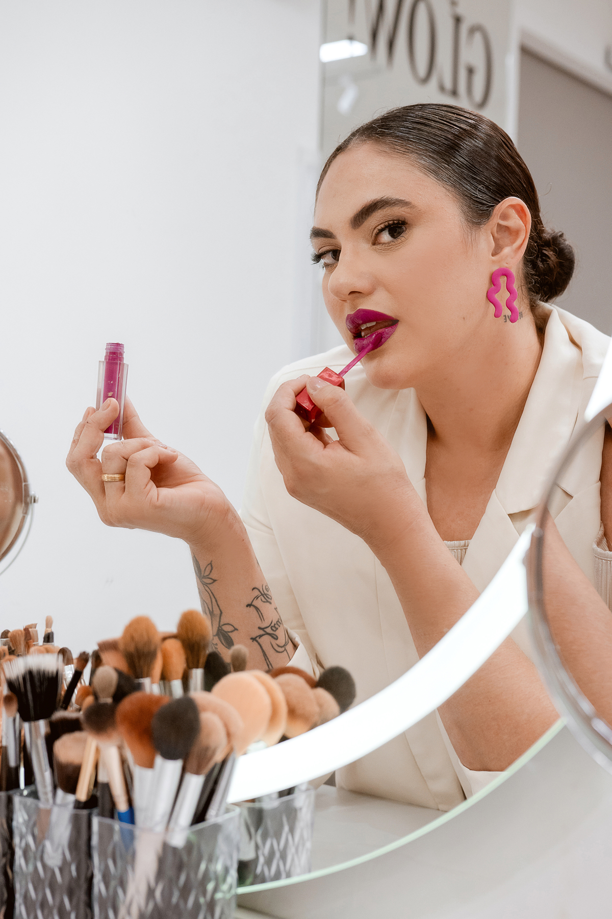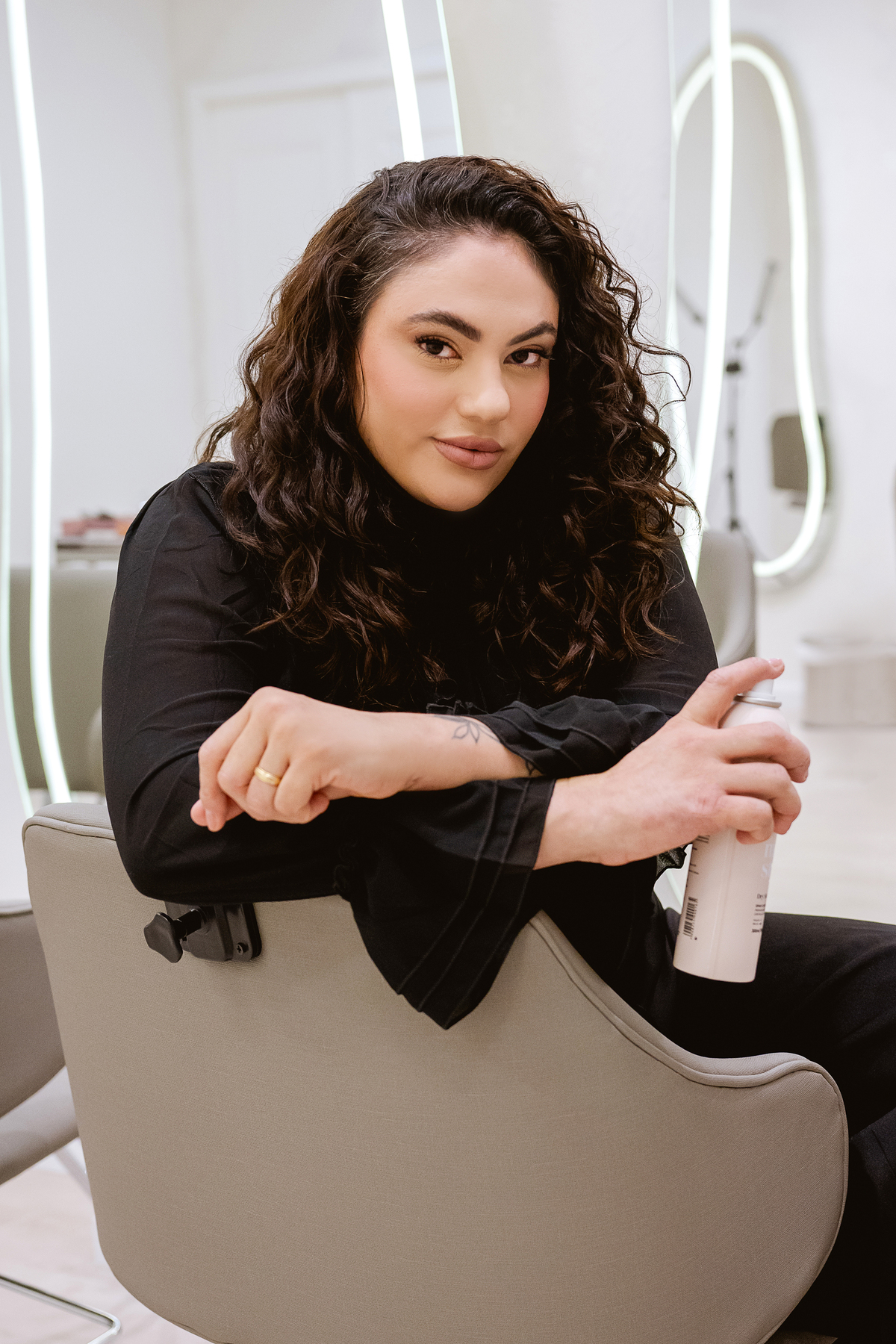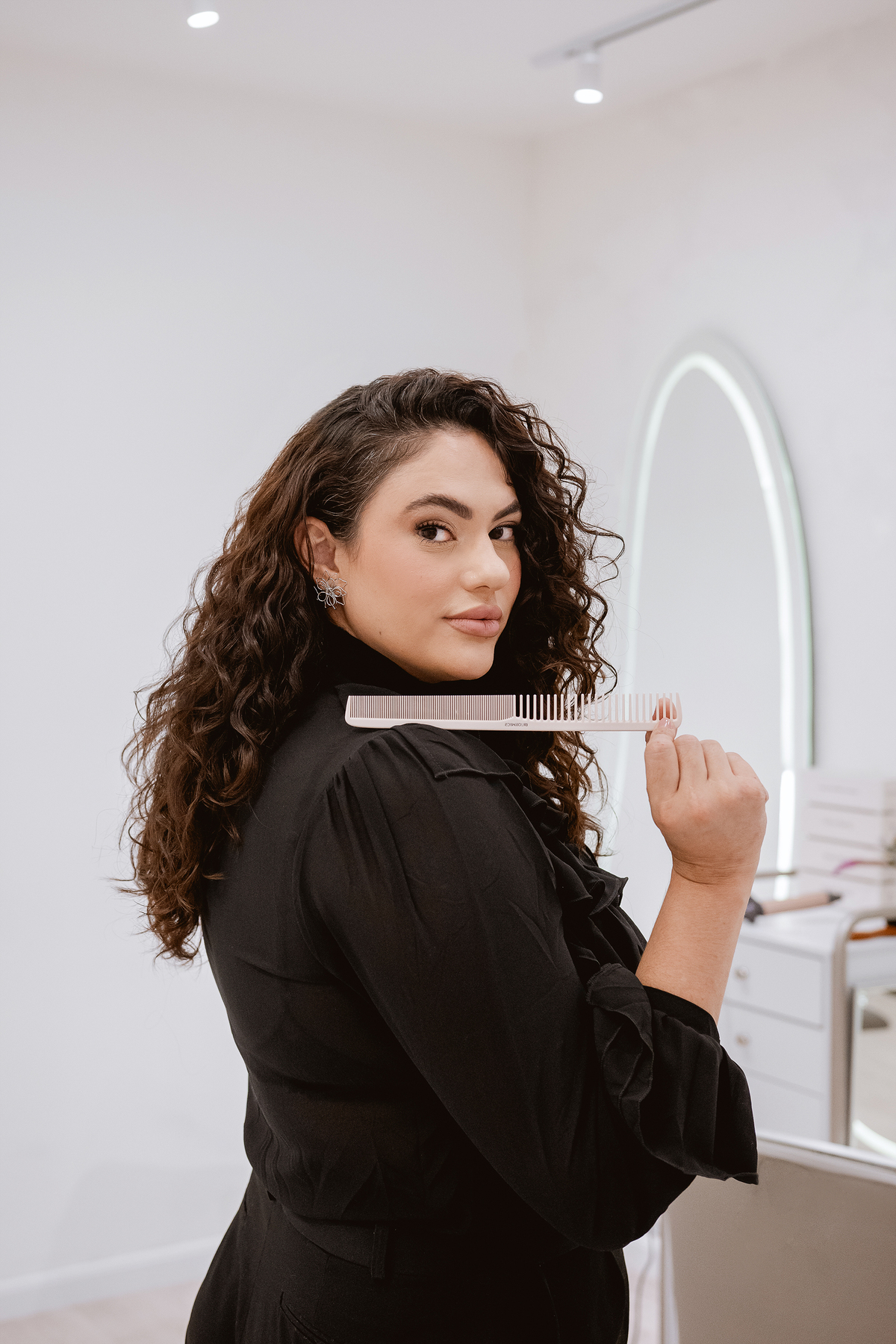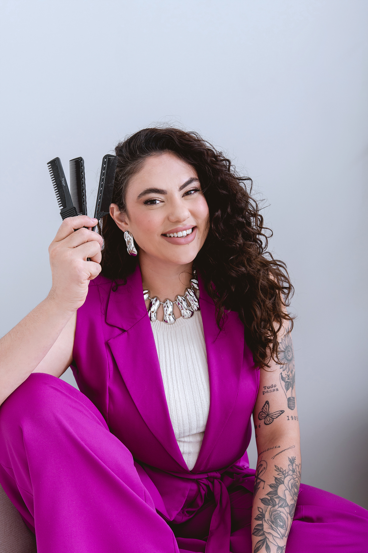 Durante o ensaio WorkStyle, buscamos traduzir em imagens o que ela já comunica no olhar e na postura: confiança de quem domina o que faz, e generosidade de quem compartilha conhecimento com intenção. Embaixadora e mentora de outros profissionais da beleza, Valéria vai além da arte do cabelo — ela inspira, forma e transforma.